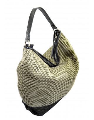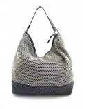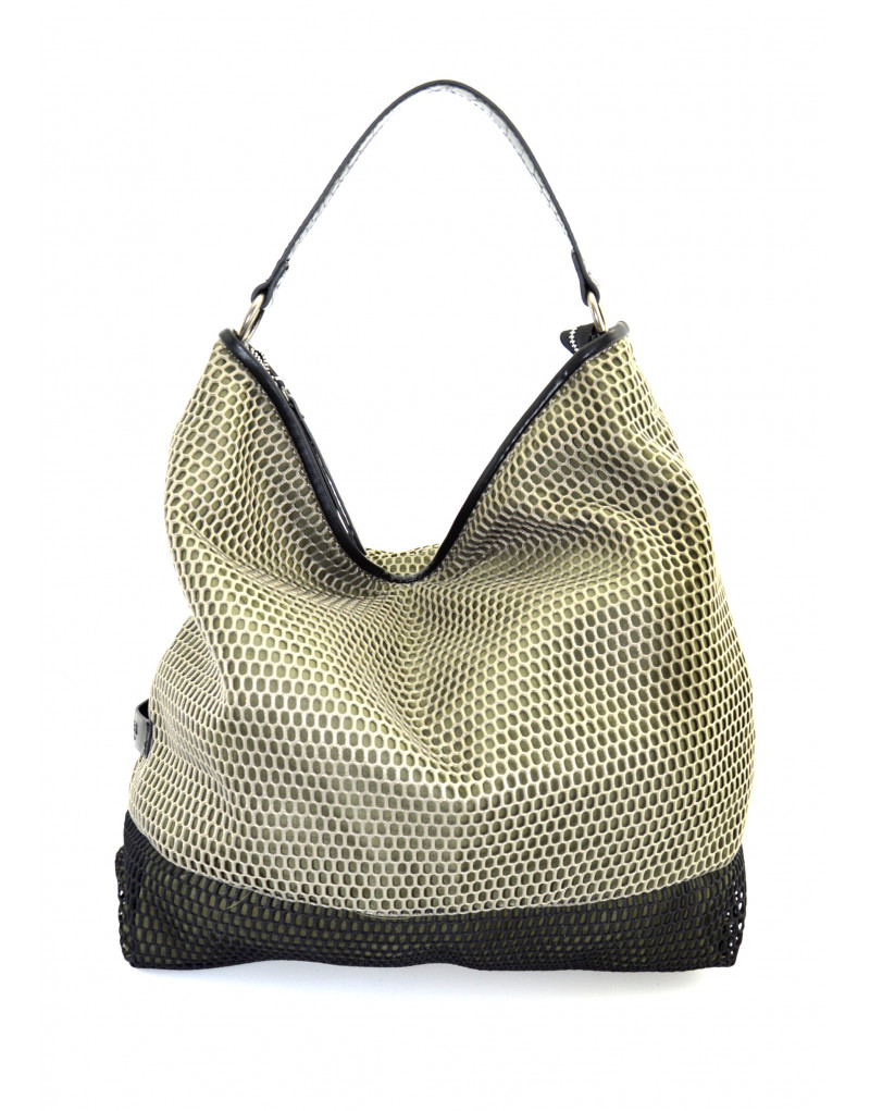 Bolso de un asa en material de rejilla en combinación de colores. Bolsillo interior con cremallera. Cierre con cremallera.