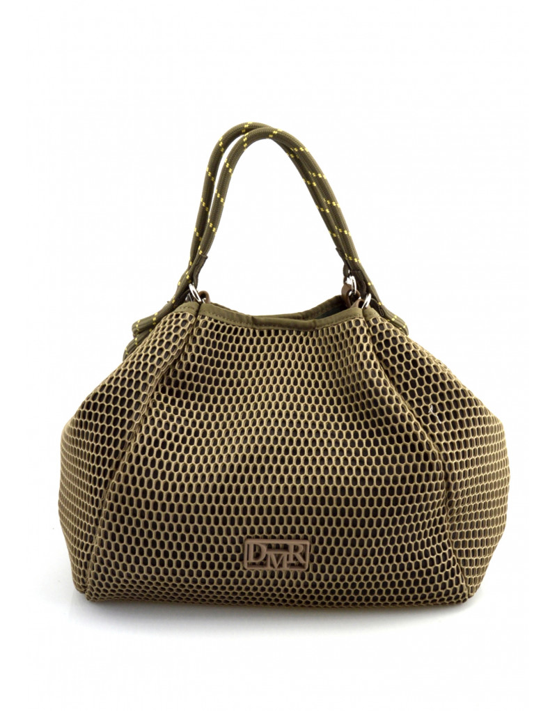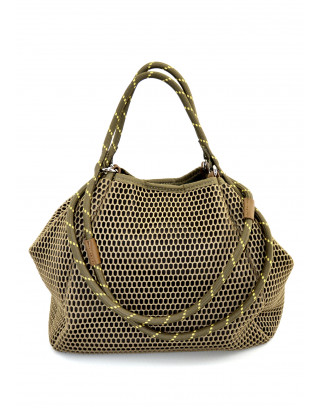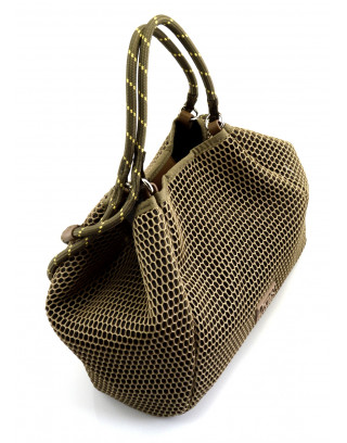 Bolso shopper en material de rejilla con asa de hombro y de mano. Cierre con imán. Bolsillo interior con cremallera.