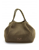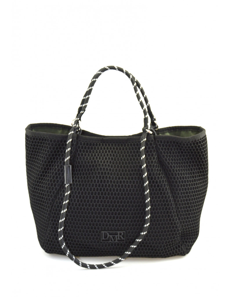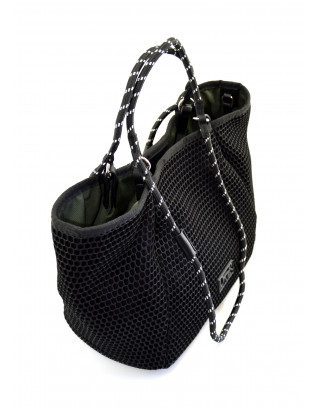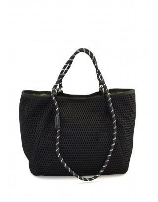 Bolso shopper en material de rejilla con asa de hombro y de mano. Cierre con imán. Bolsillo interior con cremallera.