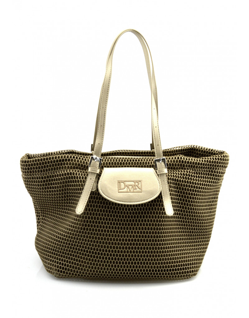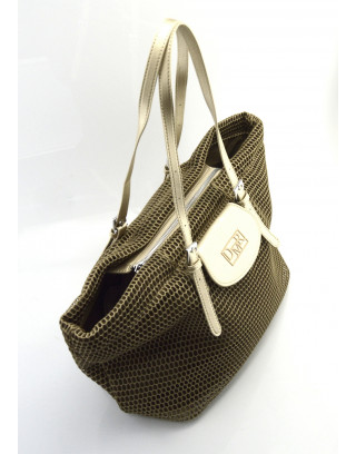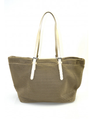 Bolso de dos asas en material de rejilla y combinación en PU. Asas de hombro regulables con hebilla. Cierre con cremallera.