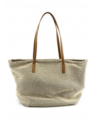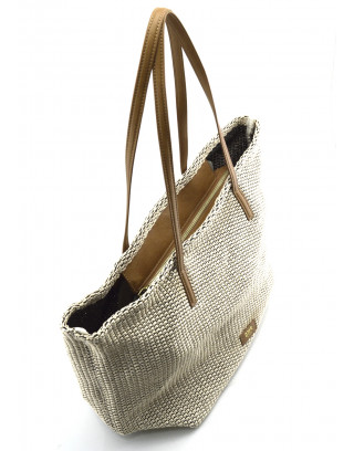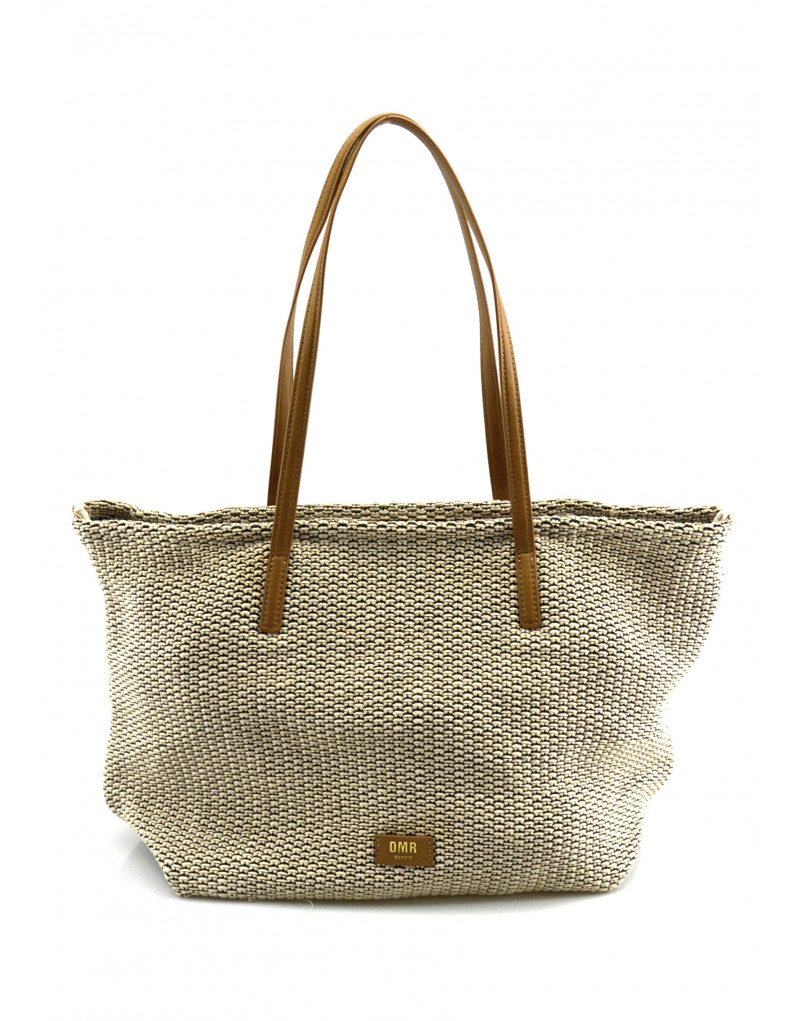 Bolso de dos asas en material tacto rafia y combinación PU. Bolso interior en el mismo material. Cierre con cremallera